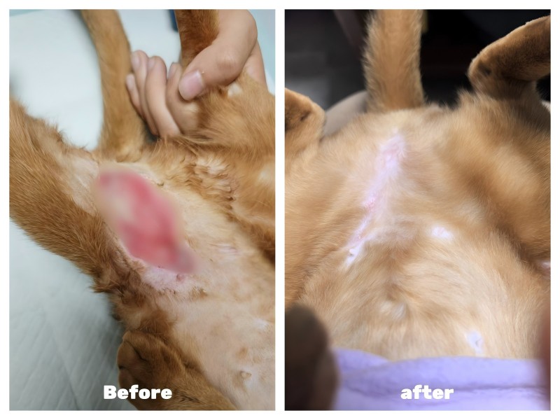 Този случай на лечение ефективно демонстрира забележителната ефикасност наВетеринарен лазер VETMEDIXрехабилитационна терапия при лечение на руптура на млечната жлеза. След осем лазерни рехабилитационни лечения, раната на болния домашен любимец е значително подобрена, показвайки добра тенденция на заздравяване и новата гранулационна тъкан е нараснала бързо. По време на целия процес на лечение не са настъпили нежелани реакции. Тази терапия значително съкрати времето за рехабилитация и облекчи болката на болния домашен любимец.